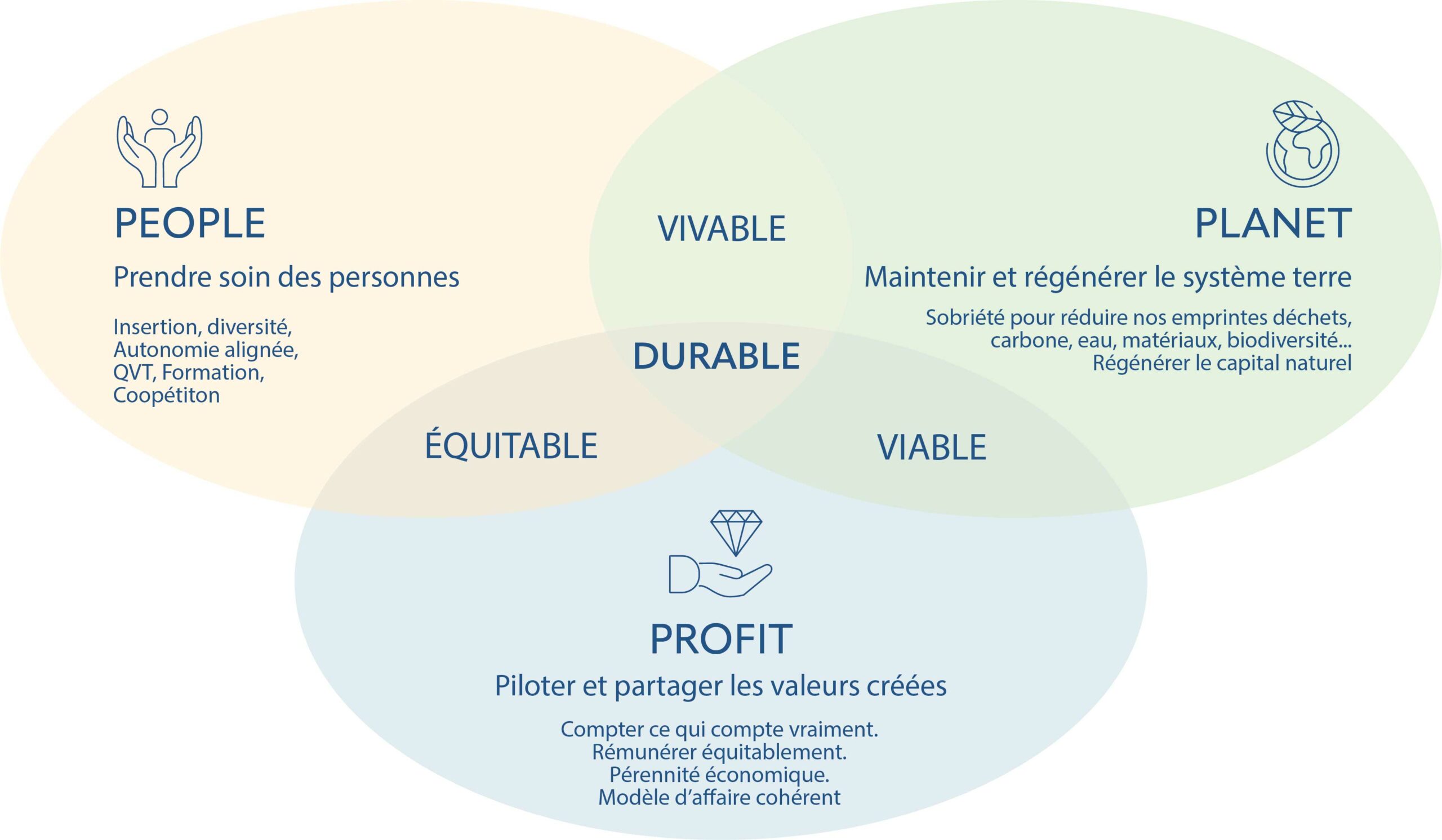 Dans cette recherche de sens, notre démarche RSE s’est structurée en 2020 principalement autour des volets « humain » et « gouvernance ». Notre participation en 2023 à la Convention des Entreprises pour le Climat est venue nous réveiller, avec une « baffe climatique ». Prenant conscience des enjeux écologiques, et de notre part à rendre dans la préservation de notre éco-système, nous nous attelons aujourd’hui à « prendre soin des 3 P » : People, Planet, Profit